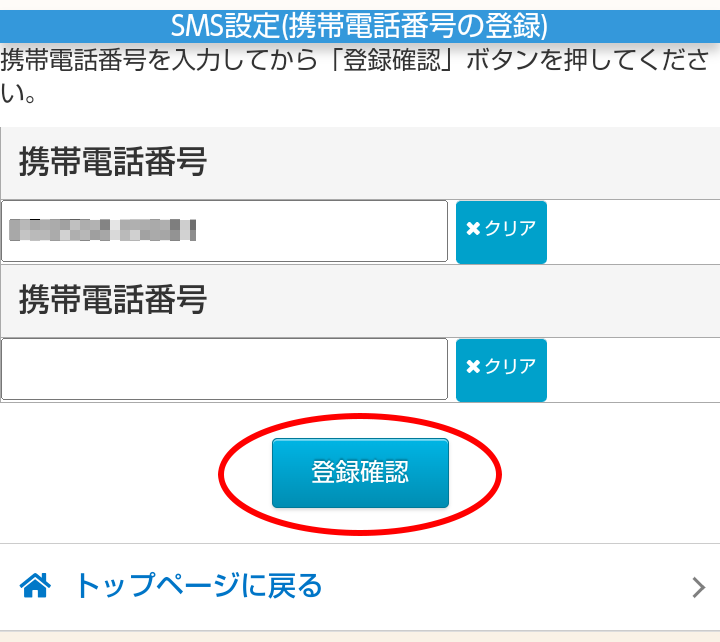 4.携帯電話番号を入力し、「登録確認」ボタンをクリックします。